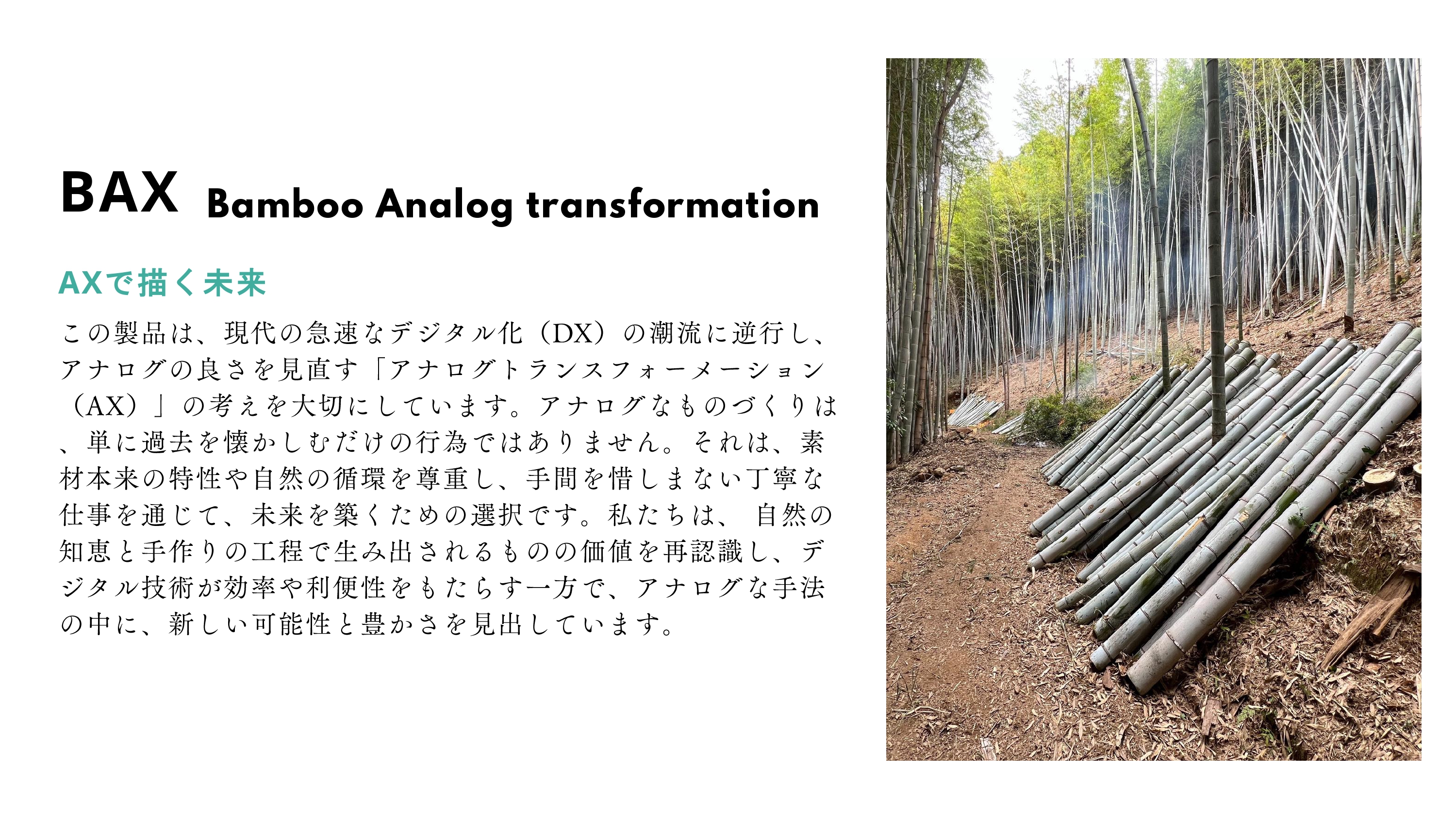 私たちは、放置竹林を資源に変え、伐採から製造まですべて自分たちの手で行っています。